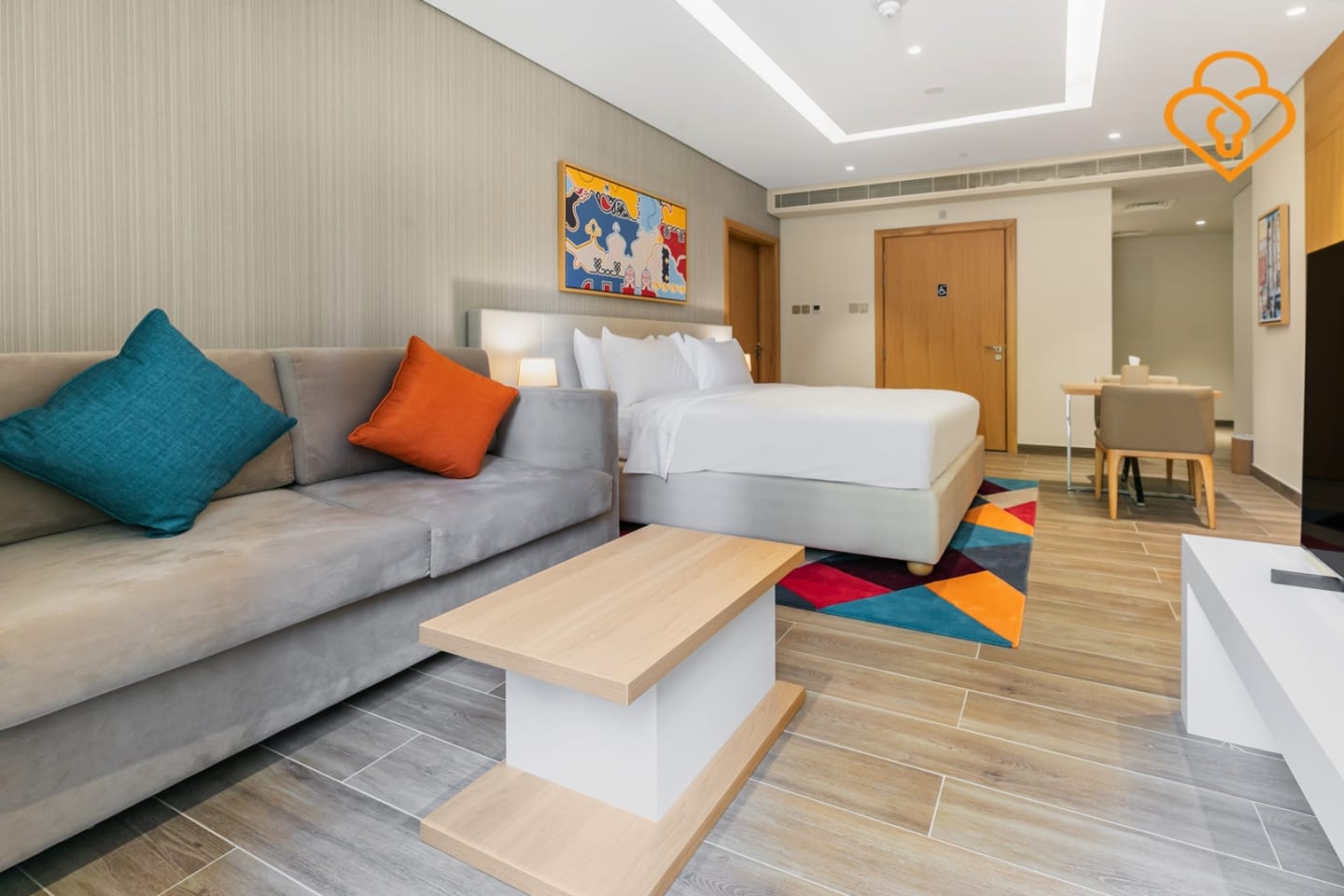 A modern Murjan studio on the plaza level refers to a newly constructed studio apartment situated on the ground level of a building called Murjan. The term "plaza level" suggests that the studio is located on the floor that opens up to a plaza or a communal area.