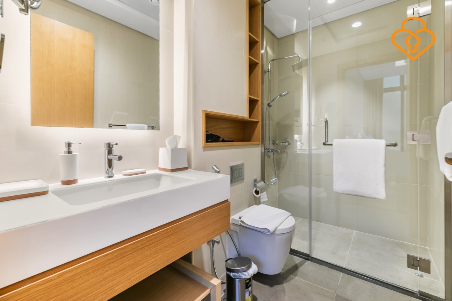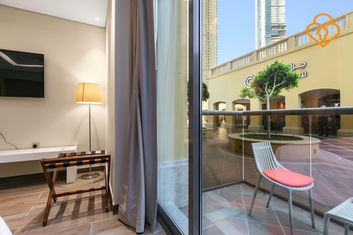 Modern Murjan studio on the plaza level is a recently built studio apartment located on the ground floor of the Murjan building. It includes a standing shower, which is a separate shower unit without a bathtub, providing a contemporary and convenient bathing experience..