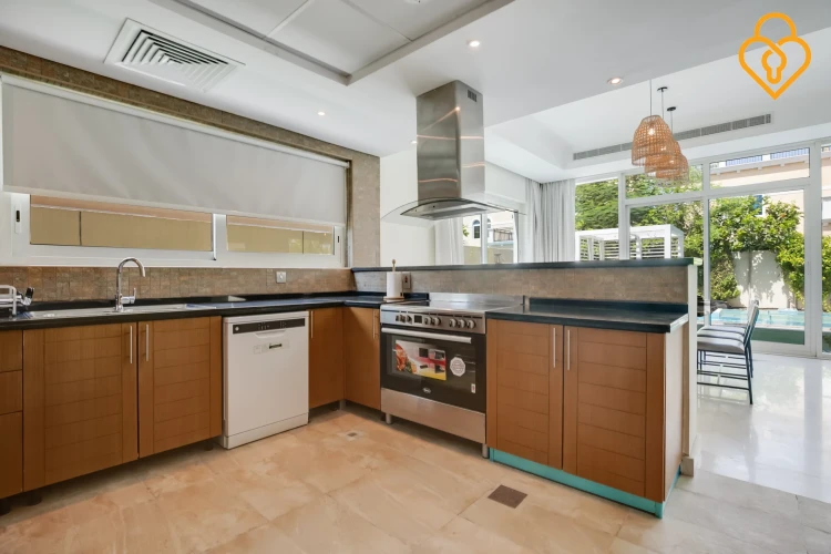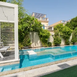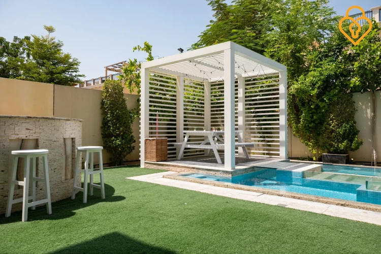 Modern four-bedroom Jumeirah Park Villa with pool featuring a private pool and jacuzzi, with 2 living areas; enjoy outdoor pergola and barbecue facility